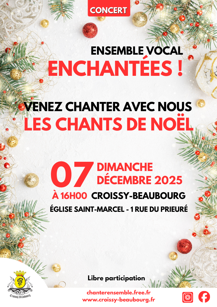 Ce dimanche 7 décembre à 16h00, l’ensemble vocal « Enchantées ! » vous invite à partager un moment chaleureux autour des chants de Noël à l’Église Saint-Marcel de Croissy-Beaubourg.