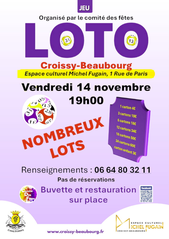Venez tenter votre chance au loto organisé par le Comité des Fêtes le vendredi 14 novembre à 19h00 à l'Espace Culturel Michel Fugain.