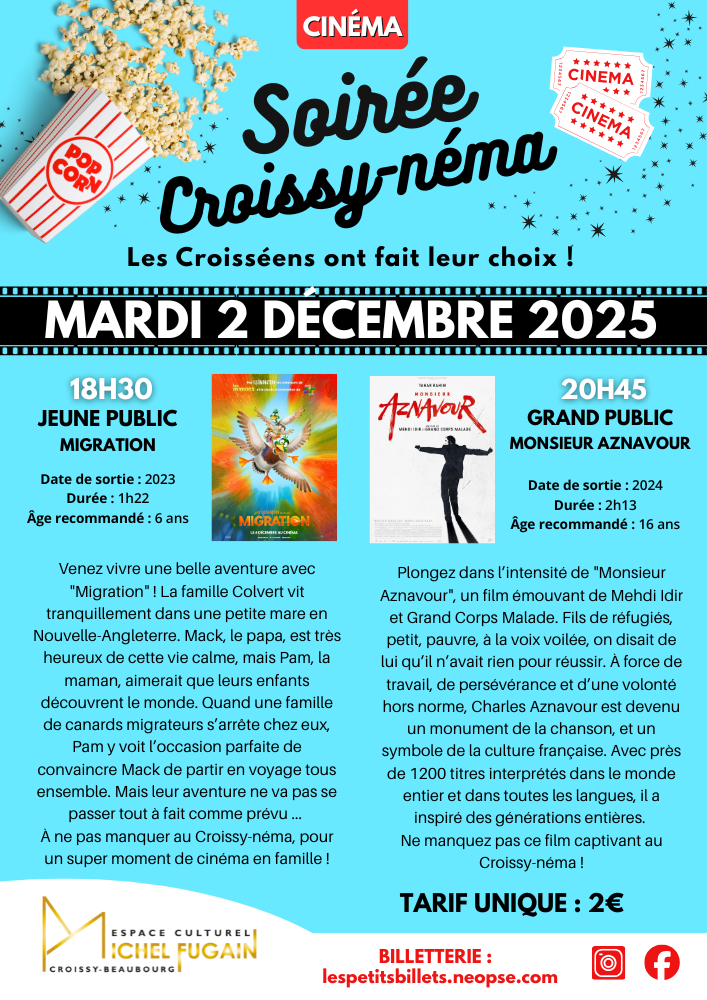 Rejoignez-nous pour une soirée cinéma exceptionnelle avec deux séances à l'Espace Culturel Michel Fugain : une pour le jeune public à 18h30 et une pour le grand public à 20h45. Les films qui seront projetés sont :