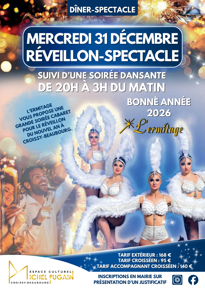 L'Ermitage vous propose une grande soirée cabaret pour le réveillon du Nouvel An à Croissy-Beaubourg ! Ne manquez pas cet évènement avec un dîner-spectacle, suivi d'une soirée dansante de 20h00 à 3h00 du matin pour fêter ensemble l'arrivée de la nouvelle année.